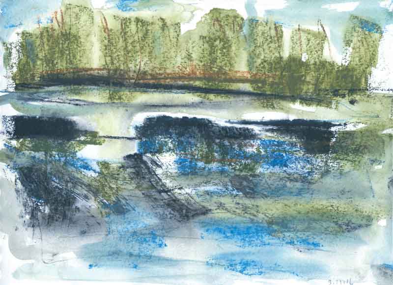 begibt sich seit 8 Jahren wöchentlich zum Malen an die Donau – Wasser und Landschaft erscheinen als abstrakte Farbstudien.